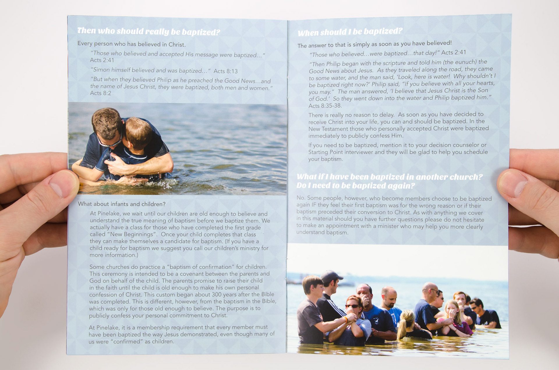 Saddle stitched brochure designed for Pinelake Church that provides answers to common questions about baptism.