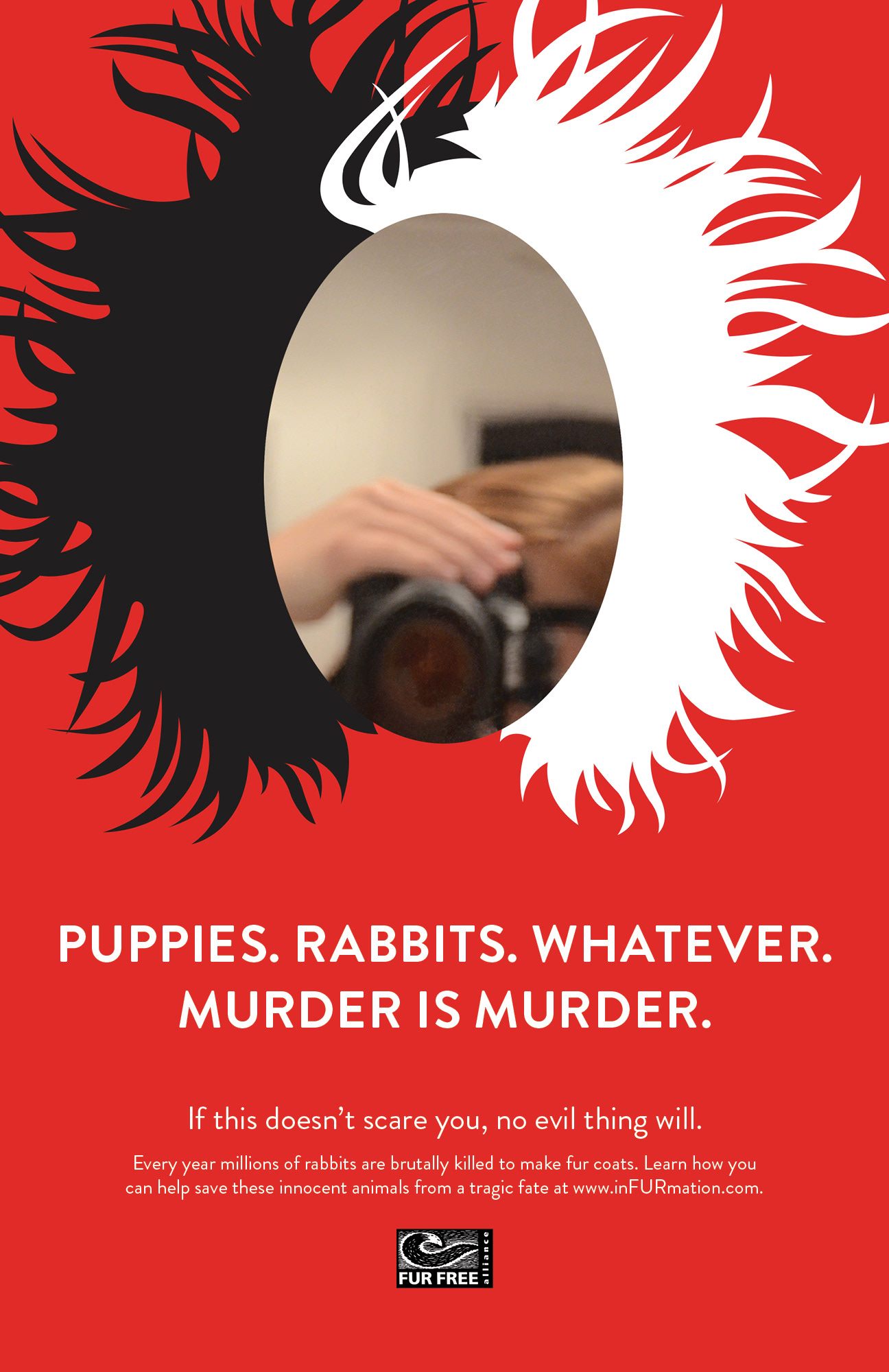 Poster series endorsing the Fur Free Alliance campaign against the use of rabbit fur. Each poster is interactive via a reflective mirror, adjustable clock hands, or a movable bullet.