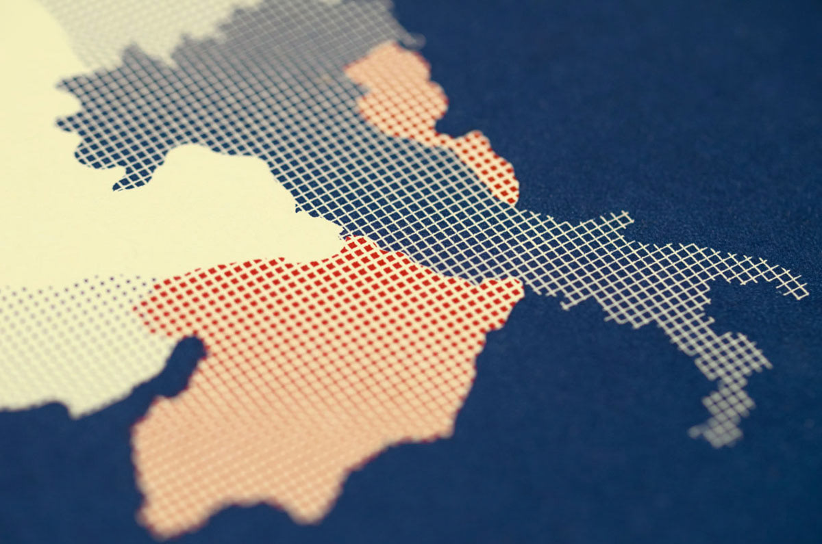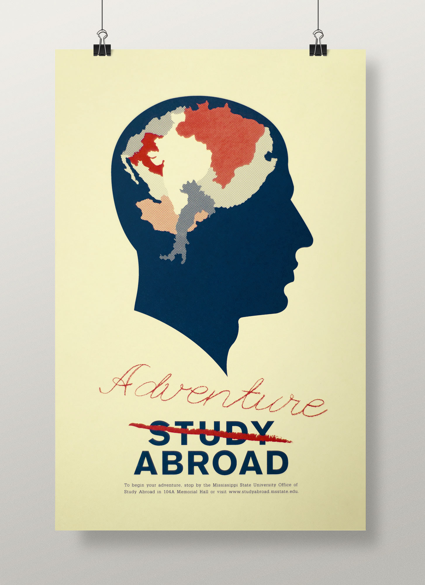 Screen printed poster promoting the study abroad opportunities available to the students of Mississippi State University. Printed on Construction French Paper.